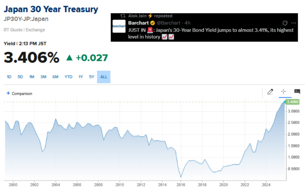 In the ‘Tweets of the Day’ segment, the Japanese 30-year yield crossed 3.4%. This is a massive increase considering it was at 0.5% not long ago—a sevenfold rise. For anyone with rolling debt or a flexible-rate home loan, this surge in the base rate will likely lead to defaults and other issues, as their EMIs could increase many times over.