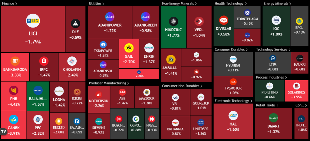 The Nifty Next 50 was also deeply red, with PSU banks bearing the brunt of the selling—Bank of Baroda, PNB, and Canara Bank were all down 3% to 4%. Gas Authority, JSW Steel, Solar Industries, HAL, DMart, Motherson Sumi Systems, LIC, Vedanta, and Naukri were all down. Hindustan Zinc, Divis Lab, IOC, Pidilite, Hyundai, CG Power, and Bajaj Holdings were some of the stocks that bucked the trend for the day.