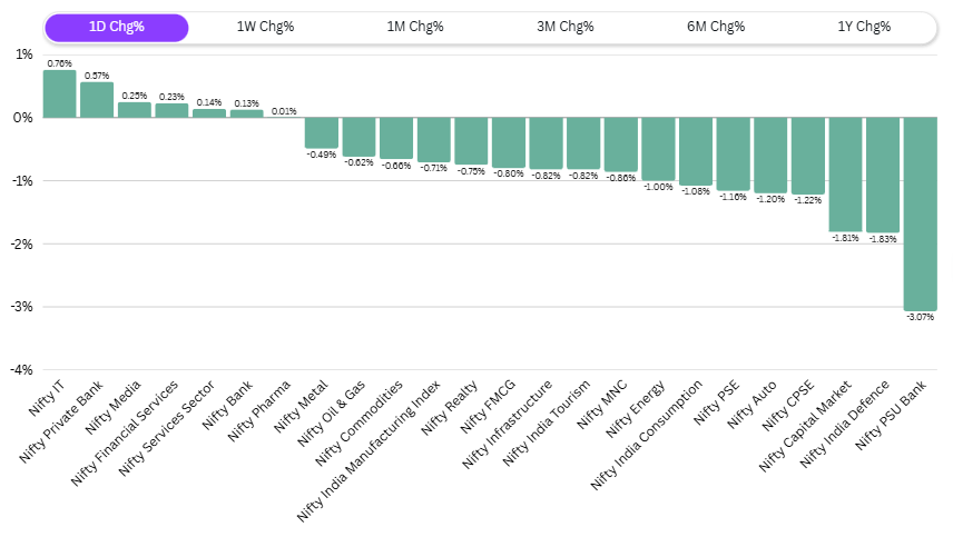 CPSCs, Nifty Auto, and Nifty PSE were all down 1.2%, signaling significant damage in parts of the market. There were minor gains for Nifty IT (0.76%) and Nifty Bank Private (0.57%), suggesting a rotation of money from PSU banks into private banks today.