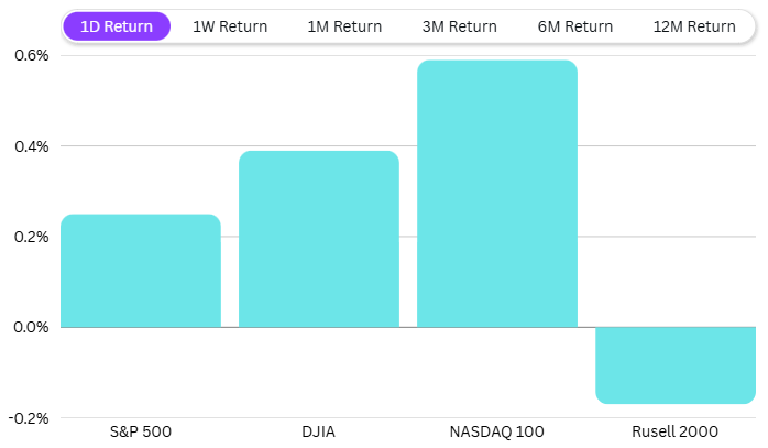 The US markets had a mixed session. The broader market was down 0.2%, but the Russell 2000 and NASDAQ 100 were racing up at 0.6%. The Dow Jones was up 0.4%, and the S&P 500 was up 0.2%.