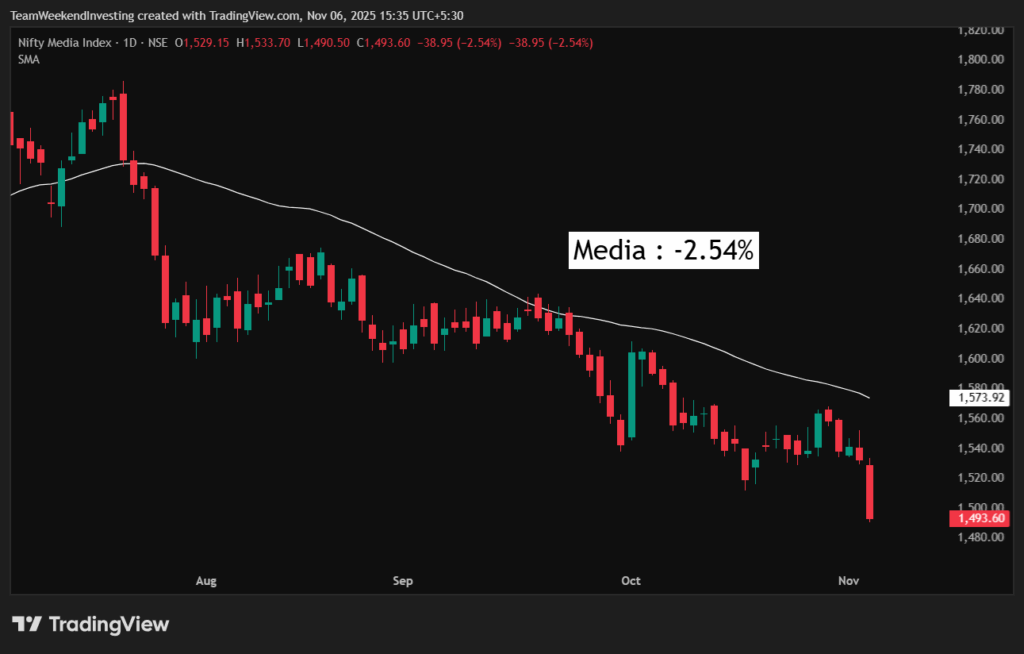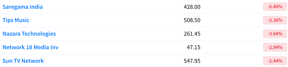 The sell-off was significant for the day, with many media stocks like Saregama, Tips, Nazara, Network 18, and Sun TV losing between 2.5% and 5.5%.