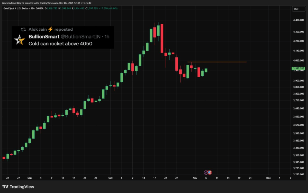 Another tweet, from BullionSmart, focused on gold’s technical setup. Despite gold recently making lower lows, the technicals suggest that as soon as it hits a pivot around 4050, there is an opportunity for a very fast upward move. The whole idea that people saw a recent top and declared gold “done” may be incorrect. There is a strong possibility that gold will make a comeback and could even surpass its previous high. Looking at gold’s journey over the last few months, it seems unlikely that this entire rally would be completely nullified, which would signify the end of the gold rally for many years. That outcome seems improbable because demand remains strong from all corners.