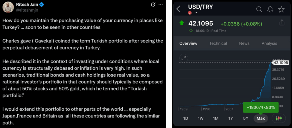In the “Tweet of the Day” section, Ritesh Jain highlighted the concept of the Turkish Portfolio. This strategy arises in countries like Turkey, where the local currency continuously debases, causing bonds or cash holdings to lose real value. Citizens, therefore, rush to convert their local currency into US Dollars or other assets as soon as they receive it. In such unstable currency environments, holding a significant amount of gold is key. The “Turkish Portfolio” is typically defined as a 50% stocks and 50% gold allocation. Ritesh suggests this portfolio would also perform well in Japan, France, and Britain, and it’s well-known that it works extremely well in India, a trend I believe will continue to be increasingly effective going forward.