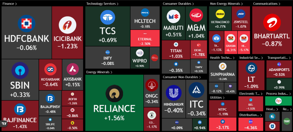The Nifty Next 50 was awash in red, with sharp cuts in Chola Finance, PFC, PNB REC, Havells, Jindal Steel, Indian Hotels, Zydus Life, and HAL Hyundai. Only a handful of stocks, like Reliance among the big heavyweights, and some gains in TCS, Wipro, and Asian Paints, managed to stay in the green.