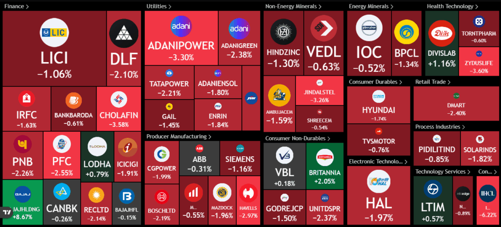The heat maps were also extremely poor. Heavyweights like Grasim and Hindalco lost 5% and 6%, respectively, while others like L&T, NTPC, BEL, Eicher Motors, Titan, JSW Steel, and Tata Steel also moved down. ICICI Bank and Bajaj Finance lost about 1.5%.