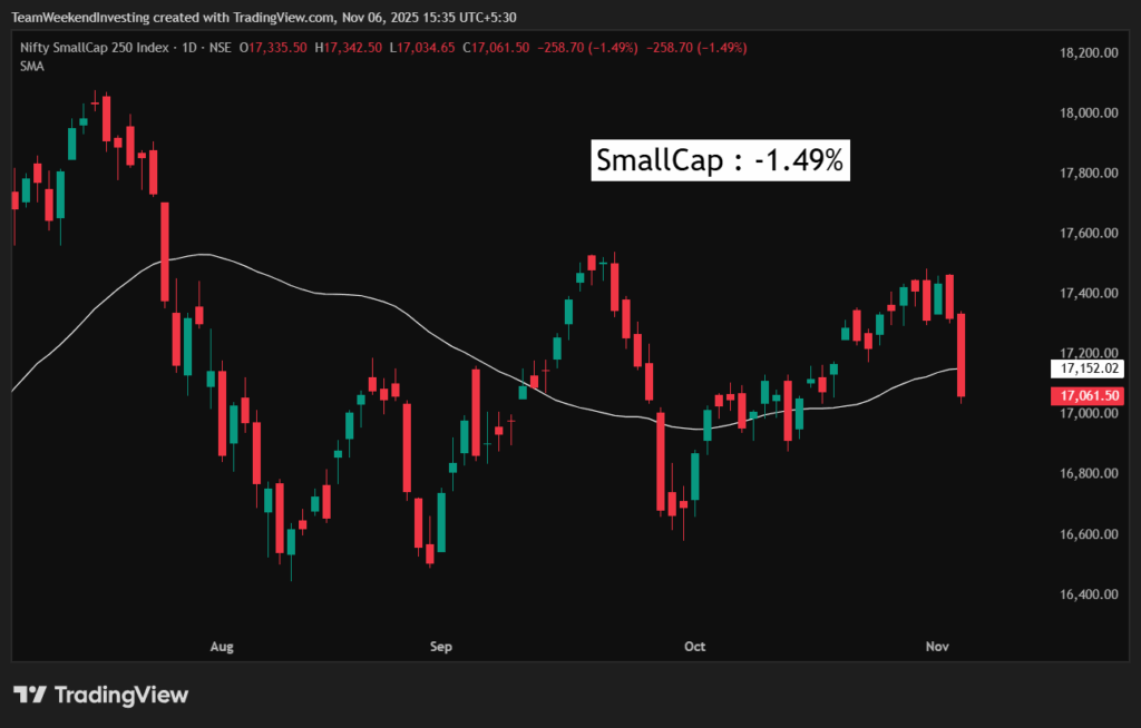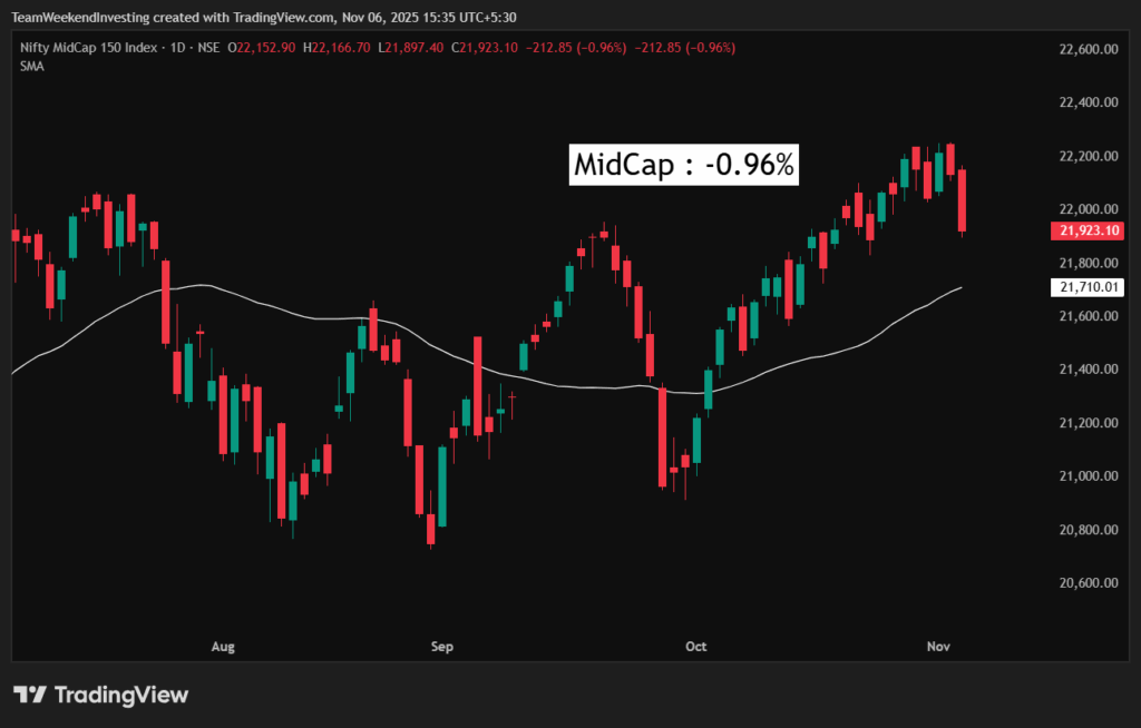 Today, the Nifty was down 0.34%. However, the real worry comes from the broader market, where we saw a “waterfall-like event,” similar to what happened in September.