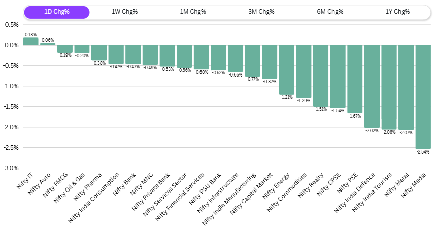 Looking at sectoral trends, hardly any sector remained in the green. Only Nifty IT and Nifty Auto bucked the trend, clocking marginal gains of 0.18% and 0.06%, respectively. Media was the worst hit, down 2.5%, followed by Metals at 2%. Defense, Tourism, Public Sector Enterprises (CPSEs), and Real Estate were all down between 1.5% and 2%.