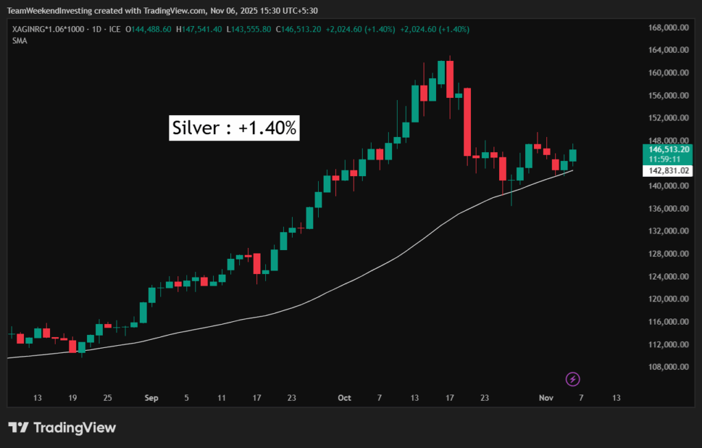 Silver is also up 1.4%, with its chart showing good support at a key trend line.
