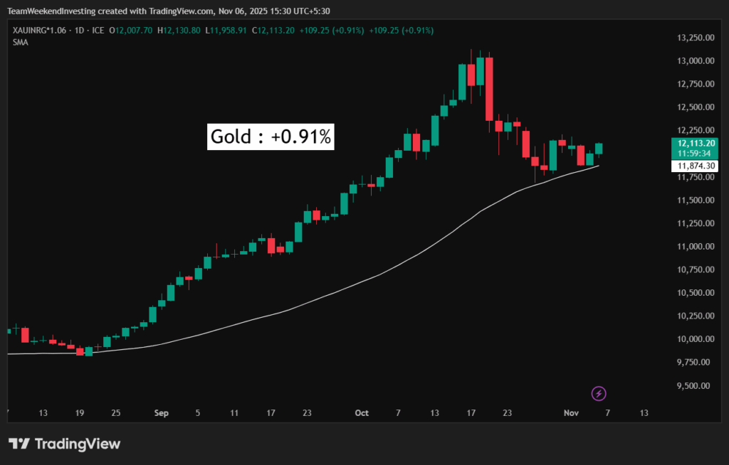 Gold is up 0.91%, hitting a value of 12,113 today. As has been observed, whenever Indian equity markets underperform, gold in rupee terms typically starts doing well.