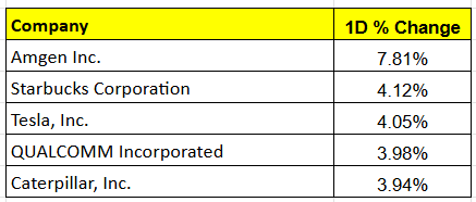 Leading the rally in the US were Amgen (7.8%), Starbucks (4%), Tesla (4%), Qualcomm, and Caterpillar (both around 3.9%). A disclosure: the Weekend Investing US portfolio may hold some of these stocks.