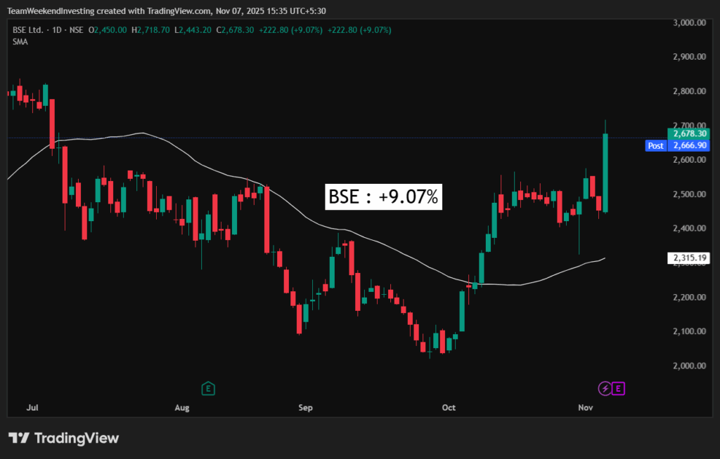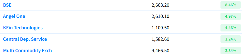 Within the thriving Capital Market space, BSE was up 8%, alongside good gains by Angel One, KFin Technologies, CDSL, and Multi Commodity Exchange.