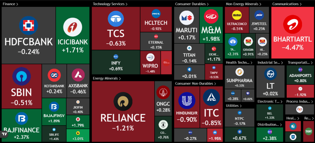 The Heat Map showed strong performance from stocks like ICICI Bank, Bajaj Finance, Bajaj Finserv, HDFC Life, Sriram Finance, Mahindra and Mahindra, Tata Steel, and Naukri. Conversely, stocks that lost some ground included ITC, Bharti Airtel (post its results), Reliance, TCS, HCL Tech, Hindustan Levers, and State Bank of India.