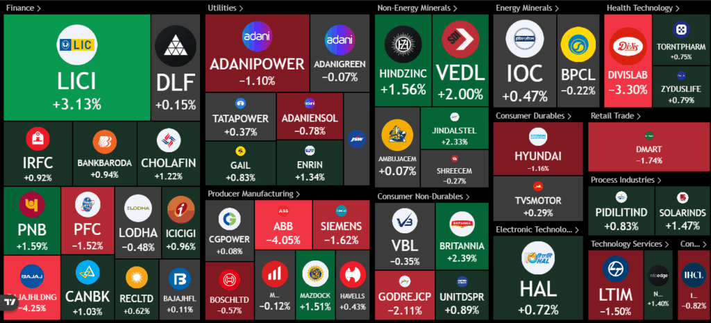 The Nifty Next space saw Divi’s Lab, ABB, LTIM, Indian Hotels, Godrej CP, Adani Power, and Bajaj Holding lose ground. However, LIC, PNB, Mazdoc, Britannia, Jindal Steel, Hinzinc, Vedanta, Torrent Pharma, PD Lite, and Solar Industries made notable gains in the mover of the day segment.