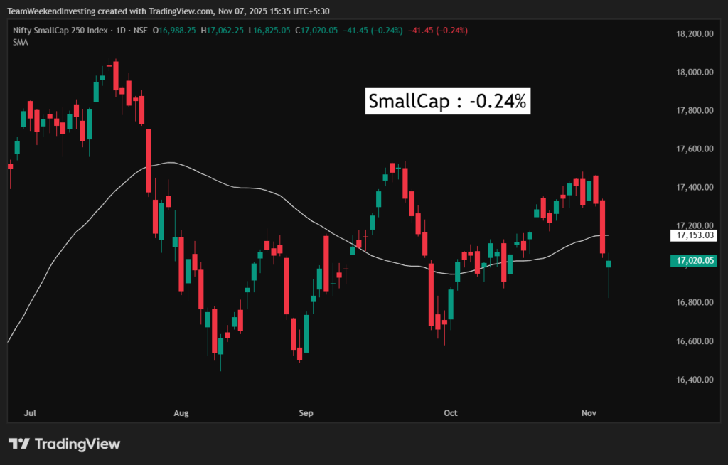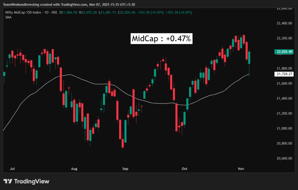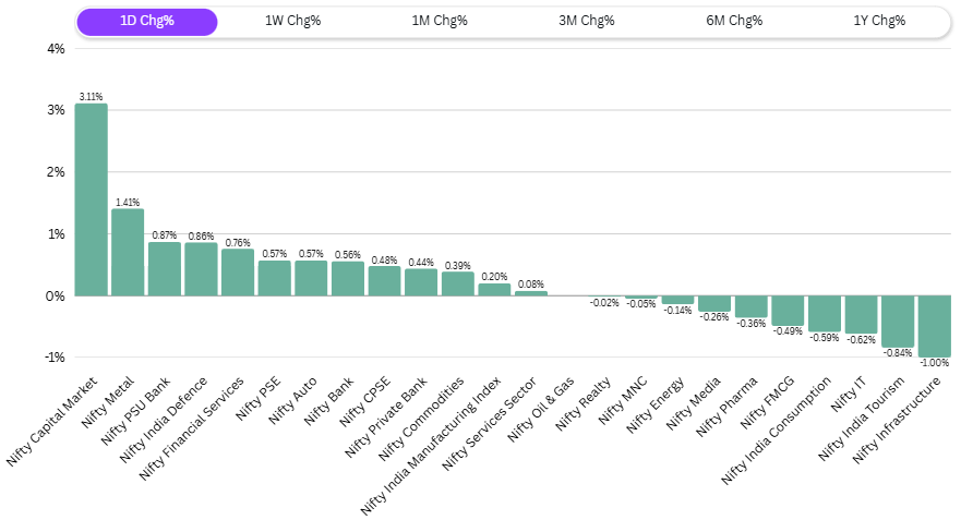 In the sectoral trends, Capital Markets were on fire, up 3.11%. Metals also did very well at 1.4%. PSU Banks, Defense, Financial Services, Public Sector Enterprise stocks, and Auto stocks (after posting good October numbers) all performed quite well. The biggest losers were Infrastructure stocks (1% down), Tourism (0.8% down), IT, Consumption, and Pharma stocks, which gave up some of their recent gains.