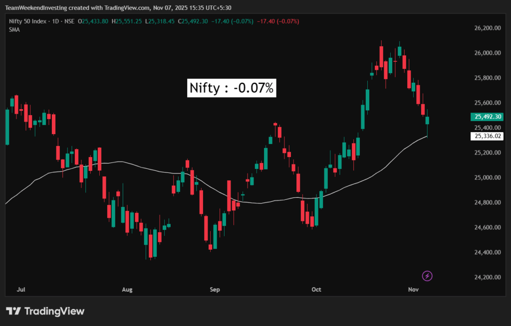 Looking at the charts, the market is taking support exactly at the average shown. The Nifty closed at a minor loss of -0.07%. After hitting a low of 25,318, it closed about 170 points higher from that bottom, ultimately losing only 17 points from the previous session’s close.