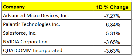 Stocks like AMD (lost 7.2%), Palantir (lost almost 6.8%), Salesforce (down 5%), Nvidia (down 3.6%), and Qualcomm (down 3.6%) were among the biggest losers in the S&P 500 space.