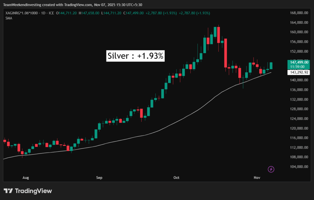 Silver was up nicely by 1.9%, trading near 1,48,000 per kg.