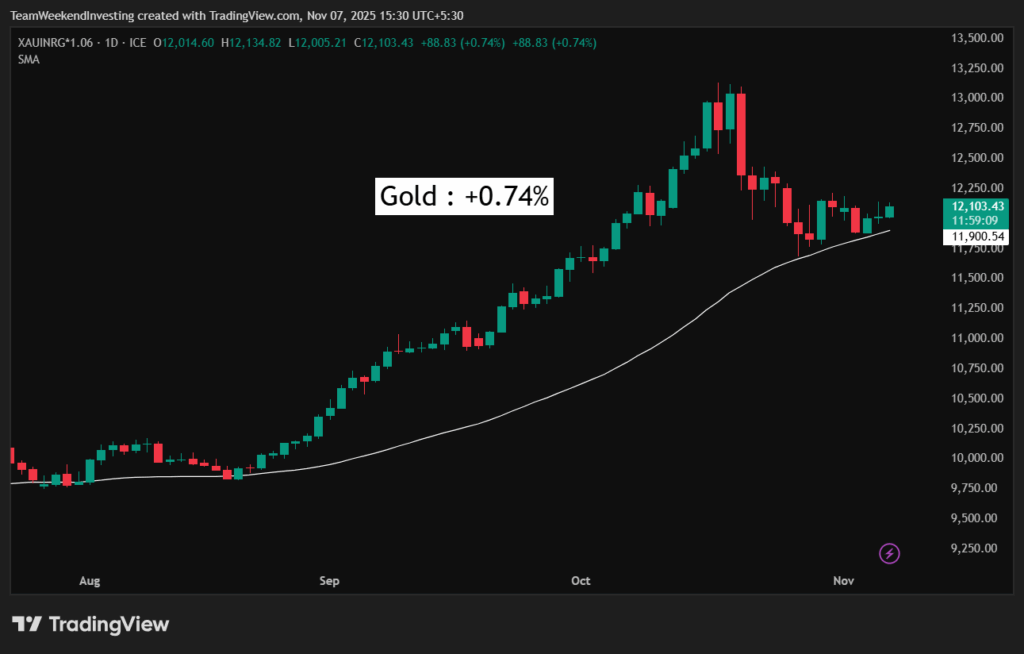 In commodities, Gold is stabilizing at the current rate of 12,103 per gram, up 0.74% for the day.