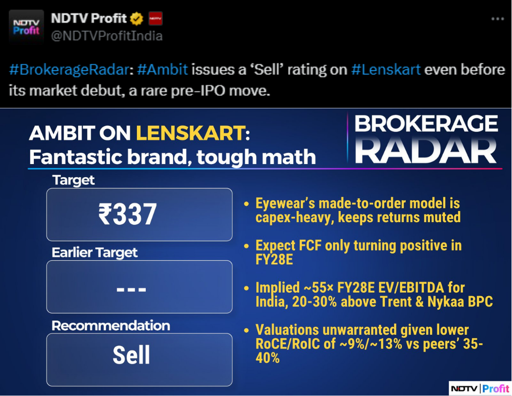 In the Tweets of the Day segment, attention was drawn to the upcoming Lenskart IPO. A surprising advisory has already issued a sell rating on the IPO even before its listing. Given that “everybody’s mother and their grandmothers” are invested either directly or through mutual funds, and despite the high subscription rate (around 28 times), this sell rating is considered a very big warning sign.