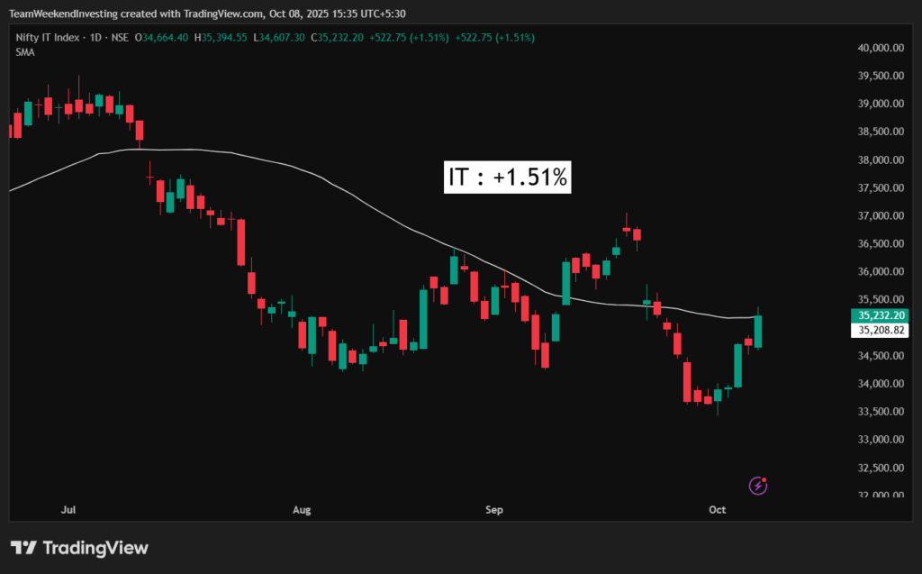 IT stocks managed to hold up well. TCS and Infosys were up between 1.8% and 2.5%. Titan also gained as gold prices surged. The company’s quarterly results came out strong, which was contrary to many expectations, and that pushed the stock up by 4.3%.