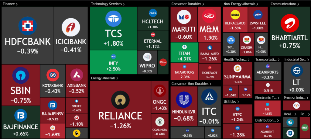 On the other hand, Reliance was down 1.2%, and auto stocks like Mahindra & Mahindra, Maruti, and Tata Motors also fell. UltraTech Cement, JSW, Sun Pharma, BEL, and NTPC were all lower, while Bharti Airtel gained 0.75%.