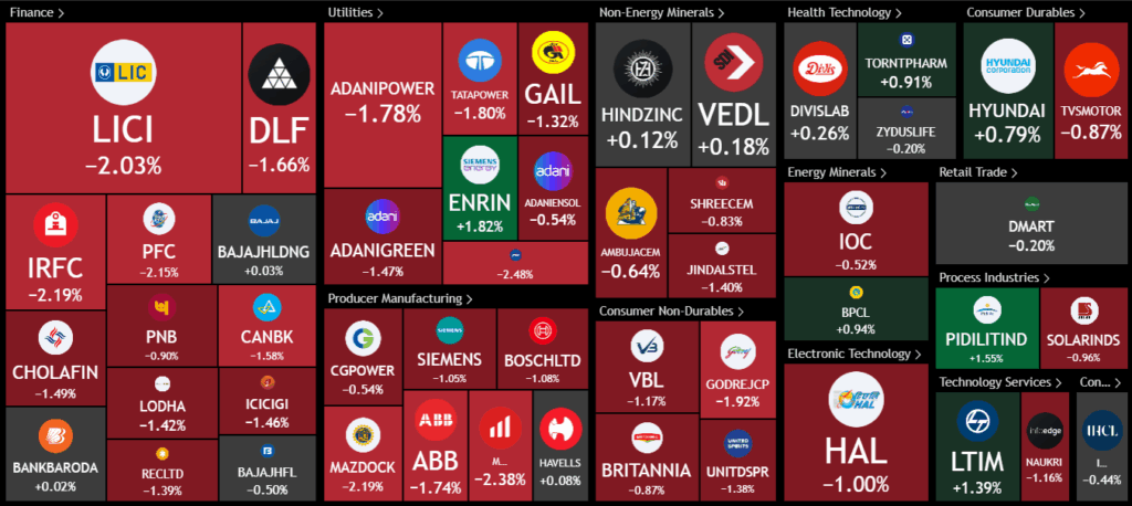 The Nifty Next 50 index was full of red. Stocks like ABB, Gail, Adani Power, DLF, and LIC were all slipping. Pidilite, BPCL, LTIM, and Eicher Motors managed small gains, but overall, things were weak.