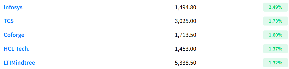 The IT index continues to do well, up 1.5%, with Infosys, TCS, Coforge, HCL Tech, and LTI Mindtree all moving higher.