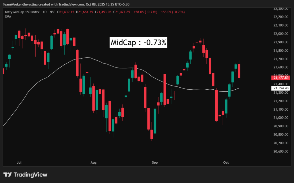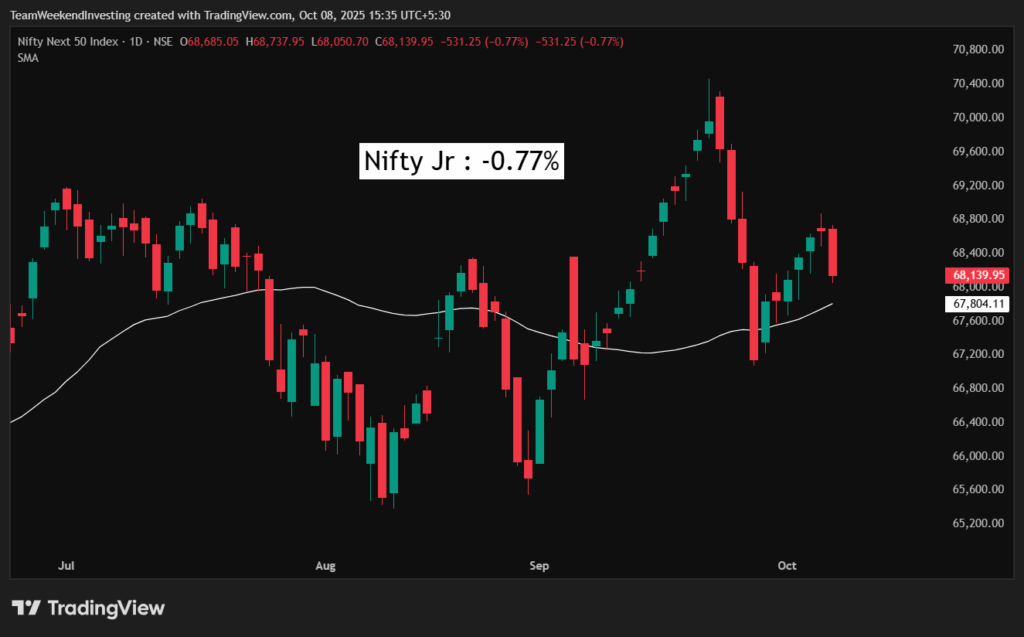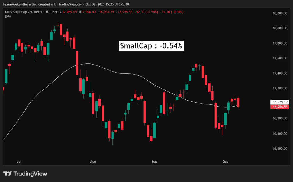 The Nifty Junior was down 0.77%, midcaps were down 0.73%, and smallcaps fell 0.54%. For the last three days, smallcaps haven’t been able to rise at all.