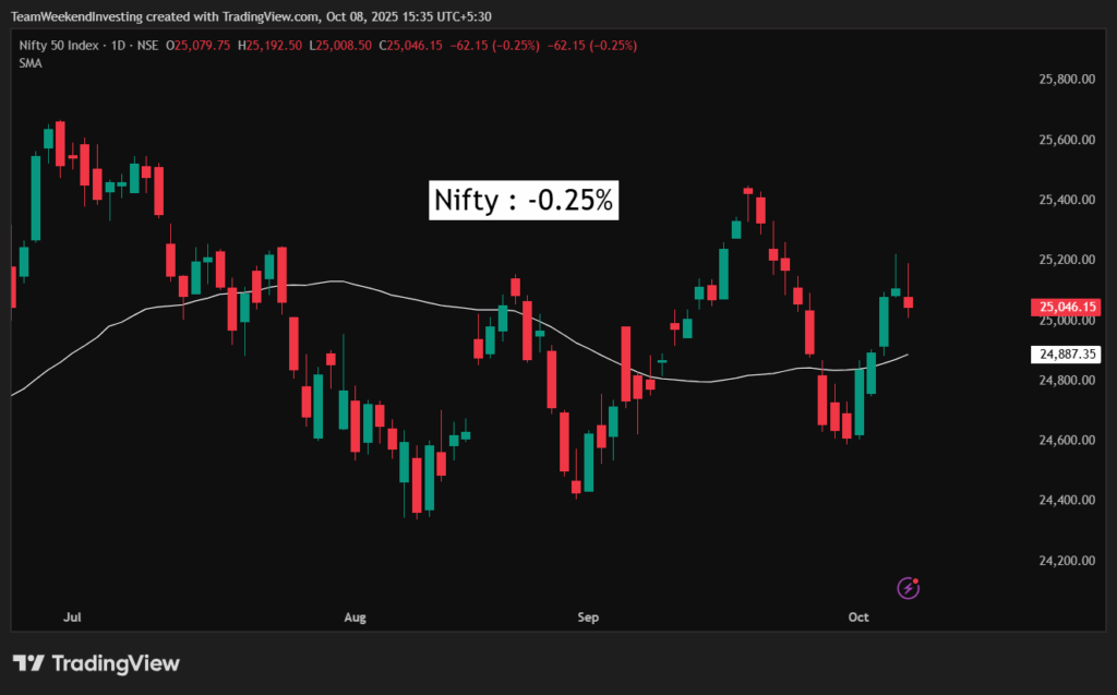 Looking at the charts, the markets did not move much lower than yesterday. It could also be because we had four very good sessions before this. The Nifty was down 0.25%, showing that we are stuck in a range. There’s no big breakdown yet, but we are not moving up either. However, it is possible that the Nifty could attempt to reach its previous highs from July and September.