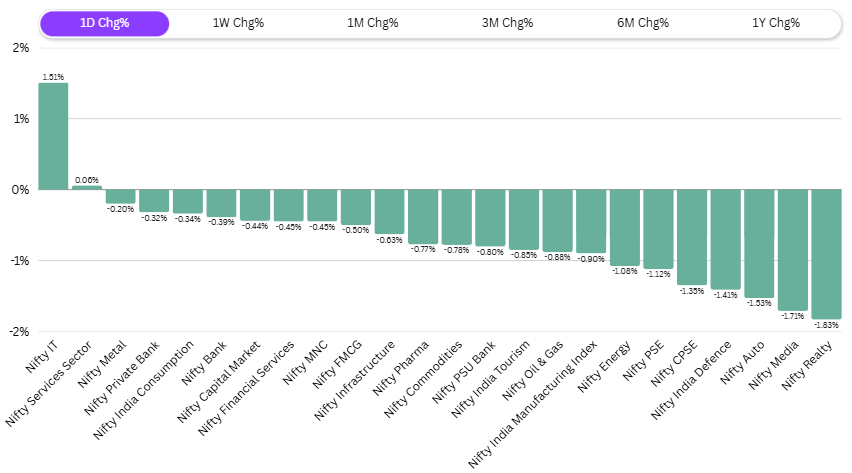 In the sectoral view, Nifty IT was the only sector that gained, up 1.5%. All other sectors were down. Real estate lost the most at 1.83%, while media, autos, and defense stocks were all down around 1.5%. CPSEs, PSUs, energy, and manufacturing sectors also fell about 1.5%. Over the last month, the picture has been quite mixed. Only PSU banks and defense stocks have held up.
