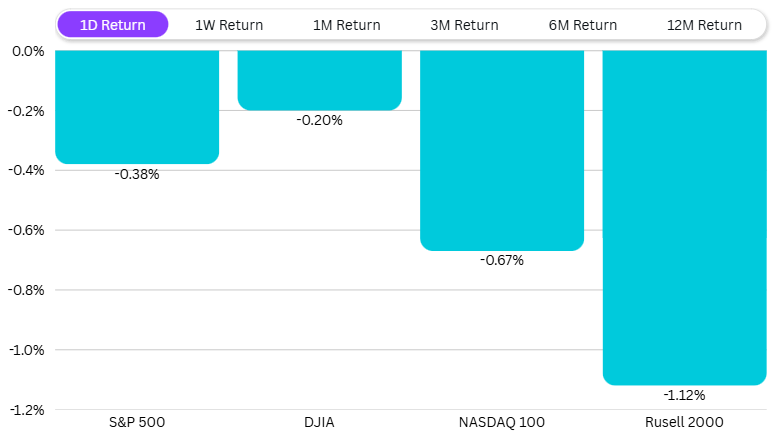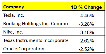 Among individual US stocks, Tesla was down 4.4%, Booking Holdings fell 3%, Nike dropped 3%, Texas Instruments was down 2.6%, and Oracle also slipped 2.5%.