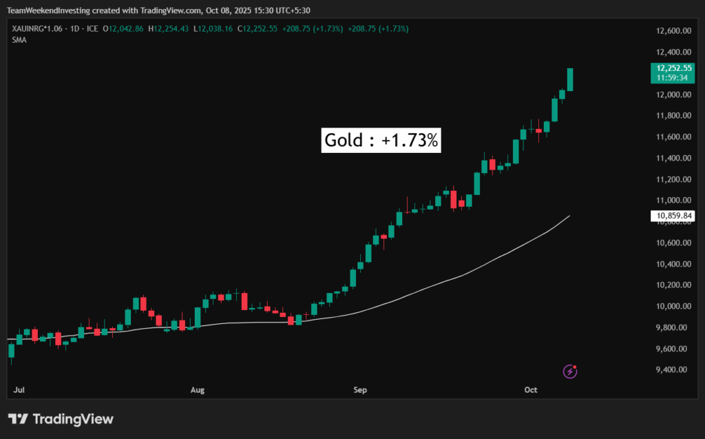 Gold was up 1.73% today, trading around ₹12,252 per gram or ₹1,22,525 per 10 grams, which is the more common way people look at it. If you see the trend from the end of August, it’s been just one and a half months, and gold has jumped from ₹98,000 to ₹1,22,000 per 10 grams—a gain of almost 25% in just six weeks. This is a very strong sign that something big is happening in the global order, and these sharp moves in gold prices are a reflection of that shift.