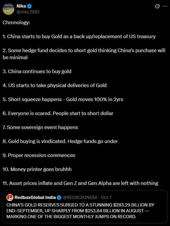 There was an interesting tweet thread showing the timeline of the recent gold rally. It explained that after the US froze Russian assets in February 2022, countries realized that their reserves could also be frozen anytime. Many nations then started reducing their holdings of US Treasuries, and China began buying gold instead. Some hedge funds shorted gold thinking China’s buying would be limited, but China kept buying more. Later, as the US also started taking physical delivery of gold and Trump returned to the picture, a short squeeze began, sending gold prices up nearly 100% in two years. This could now lead to a sovereign event, hedge fund losses, or even a recession.
