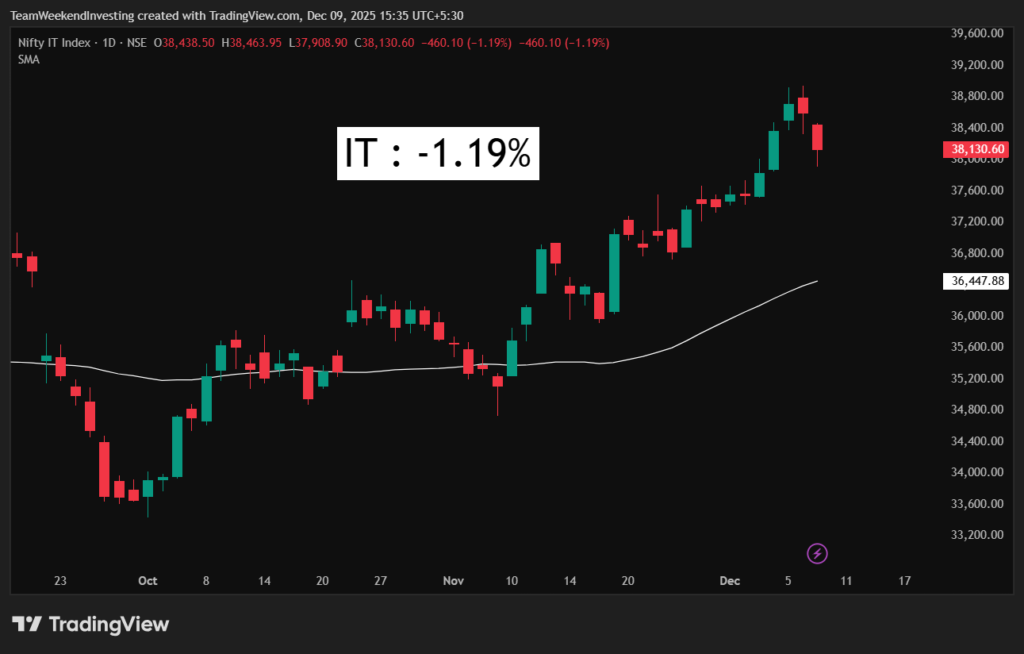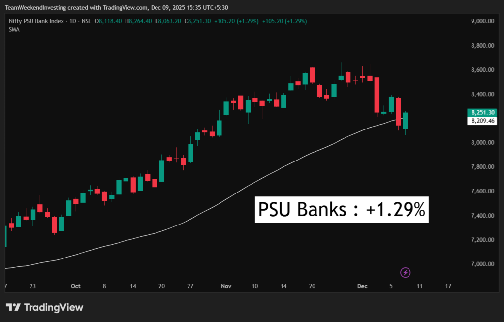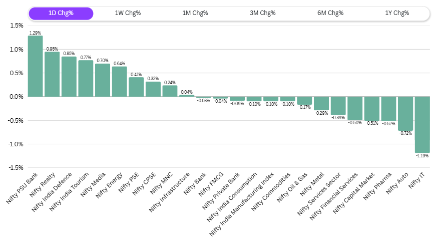 In the sectoral trends, you can see positive moves in PSU banking space, 1.29%. Real estate, nearly 1%. Defense, 0.8%. Tourism, media, energy having some gains near half a percent. On the falling side, you had services, financial services, capital markets, pharma, all down half a percent. Autos smashed down 0.72%. IT down 1.19%. So IT surprisingly was smashed down today the most, which was perhaps spared yesterday. If we see on a weekly basis, IT is still up 1.5%. You can see that despite today’s up move, the last one week is down for every sector except IT stocks. Bank of India, Canara Bank, Indian Bank, UCO Bank and PNB were some of the banks which caused a short covering or a small bounce in PSU banks. The trend still looks a bit downwards. Coforge, Tech Mahindra, HCL Tech, Wipro and TCS were leading the IT sector down, although IT by itself is looking quite alright on a medium term basis.