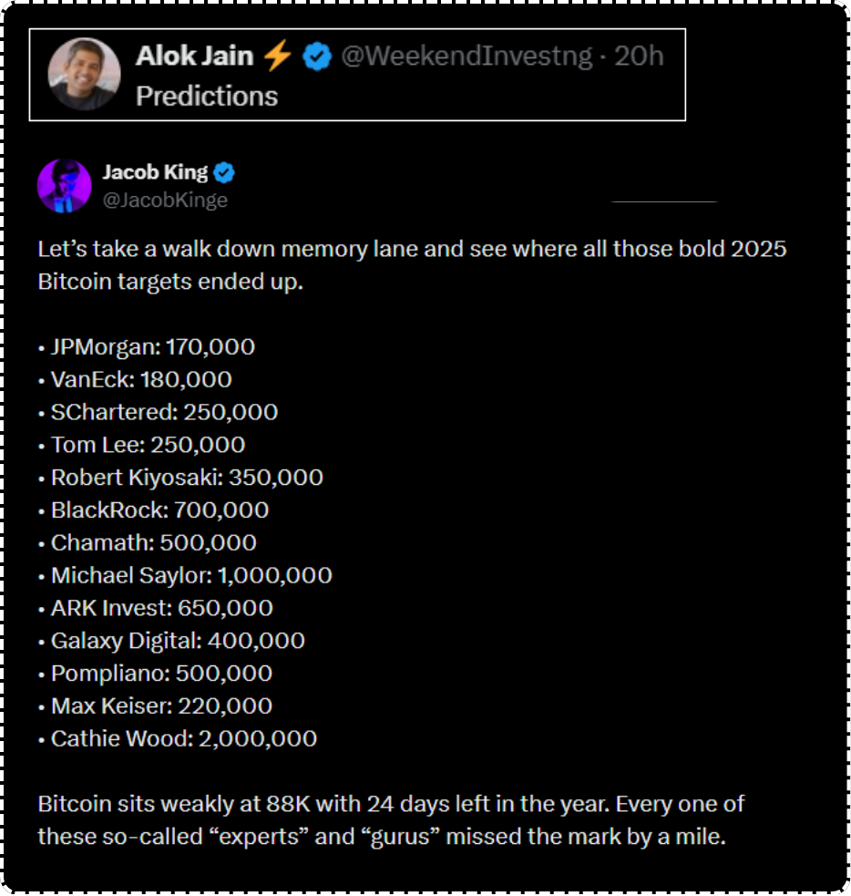 So in this case, Bitcoin was supposed to be at 2 million according to Cathie Woods. It was supposed to be 1 million according to Michael Saylor. It was supposed to be 350,000 as per Robert Kiyosaki. And mind you, these are not any, you know, wayside YouTube analysts here, these are respected fund managers managing billions of dollars of fund. And that’s how this prediction game goes. You can predict anything, people will invest with you based on those predictions, and then those predictions don’t have to be right because another prediction will come by that time. And you very well know that we are at 88,000 or 90,000 in Bitcoin and we are nowhere near these inflated figures to be achieved by end of December. So almost everybody will miss the prediction by a mile. And that’s what the video from the previous day actually also talks about.