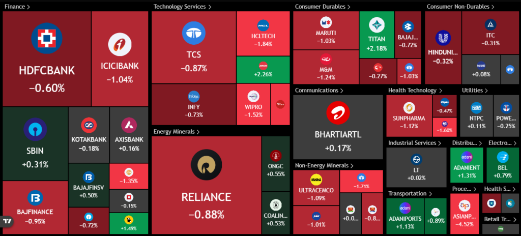 Greens are difficult to find on the screen. On the Nifty heat map you can see greens in Shriram Finance, you have some green in Titan, Adani Enterprise, Bharat Electronics, Adani Ports, and some in Eternal.