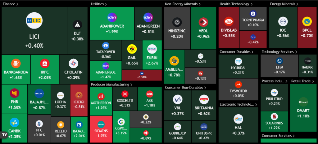 The Nifty Next 50 heat map is much, much better. So you can see large cap top half not so green, but large cap next half very green. So somehow there’s a very distinct nature of moves between Nifty 50 and Nifty Next 50, although all are large cap names. So here you can see very few reds actually. Siemens, ICICGI, Divi’s Lab, then you have BPCL, JSW Energy, and Zydus Life. These were the ones losing ground. Some good grounds made back up in Adani Power, Adani Ensol, Enrin, Bank of Baroda, Canara Bank, PNB, CG Power, and so on.