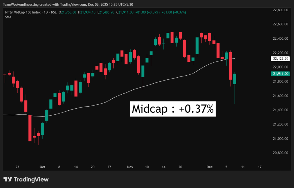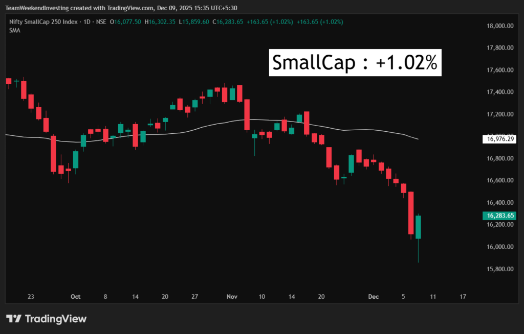 Mid caps are up 0.37%. Exactly the same story. Perhaps we are making a candle like this what we did early November and then, you know, we went up a bit. That is also possible here. The Thursday move is going to determine significant part of that. Small caps also came back from 15,860 to 16,200. So that’s a good pullback in small caps. Although the downtrend remains intact.