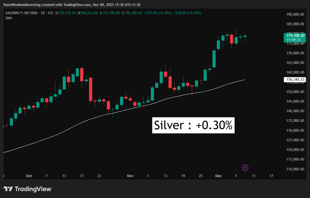 Silver is inching up 0.3% on silver, again very near 179,000 per kilogram.