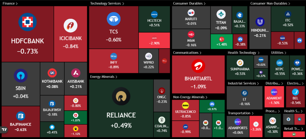 In the Nifty Heatmap, there were very few greens. Reliance was holding on at 0.49%. Tata Steel, Hindalco, Sun Pharma, ITC, and Bajaj Auto were some of the names holding out. TVS Motors and HDFC Life also showed some gains. There were losses in Eternal, Infosys, ICICI Bank, HDFC Bank, Bajaj Finance, Adani Enterprise, UltraTech Cement, and others.