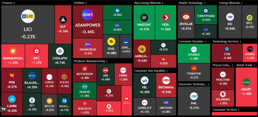 In the Nifty Next 50 heatmap, we had losses in Bank of Baroda, IRFC, Swiggy, D-Mart, Naukri, Bosch, and several others. Some gains were seen in commodity stocks like Hindustan Zinc and Vedanta, as well as in Hyundai and Torrent Pharma, and Tata Motors along with Adani Ports.