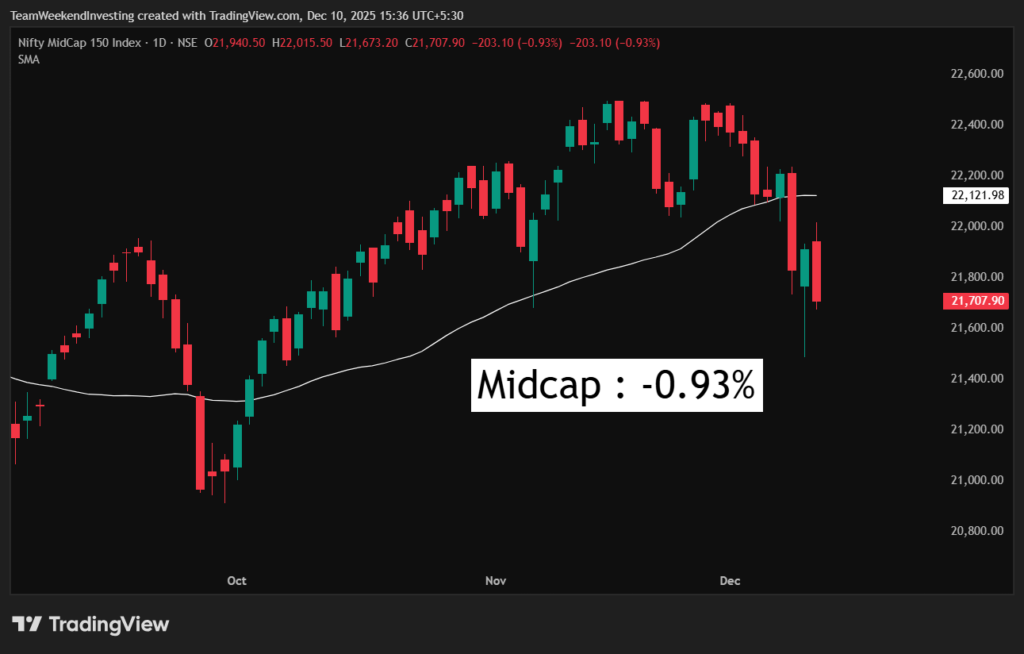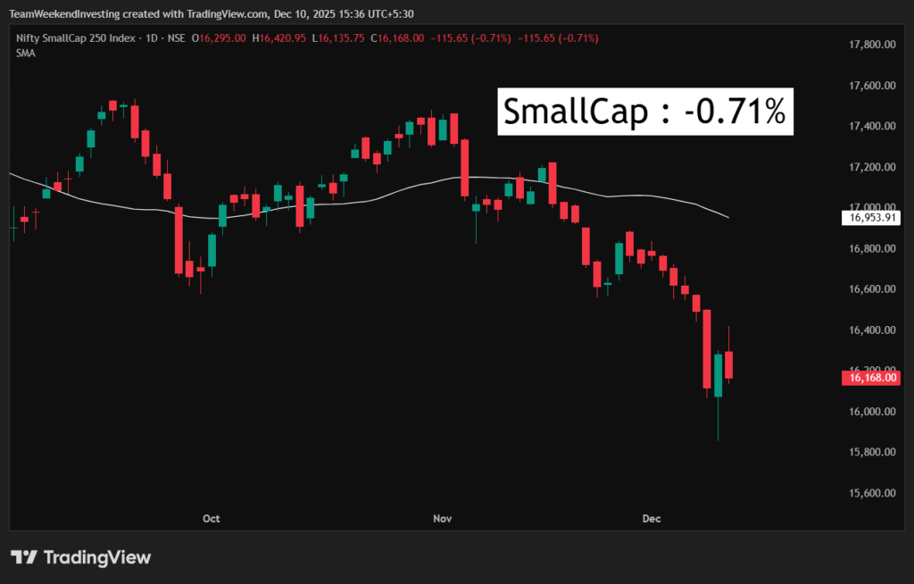 This is where the damage was more pronounced: mid caps have closed at a new few-months low. Yesterday’s gain from open to close was completely smashed down, with a 0.93% drop in mid caps and a 0.7% drop in small caps, which was also pretty damaging. We are potentially oversold. There was a bounce, but that bounce did not last. Now the next move, unless we cross these two days’ high, perhaps that is when the markets will start to get some strength and confidence.