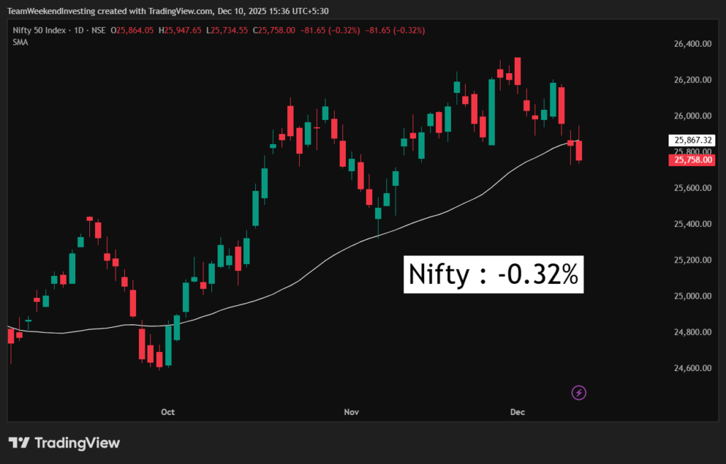 Looking at the market chart, this is the third day running where Nifty also has not been able to hold on. We are decisively in a short-term downtrend for sure, although how far down is not known. We’ve closed this gap that was available here, and the next pivot perhaps is somewhere near 25,300. So that’s sort of the natural next stop for the markets.