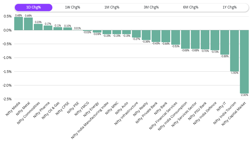 On the gaining side, metals gained a marginal 0.4%, and media also gained 0.48%, along with Pharma, Oil and Gas, and CPSEs, all with very small gains. So primarily, we had most sectors on the down.