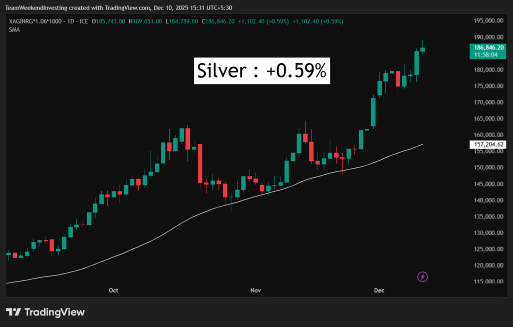 Gold is also slipping a bit, with the rate at 12,854 per gram. However, silver is climbing new highs, with the price for silver in rupee terms at 186,000. So, silver is actually leading gold, and that happens in a precious metals long-term rally. Gold dominates the first part of the rally, and then silver takes on for the next part, which has usually been seen.