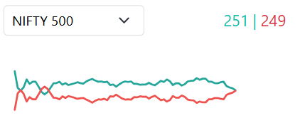 The advance-decline ratio was relatively flat throughout the day, with 251 advances to 249 declines, indicating a close match between bulls and bears.