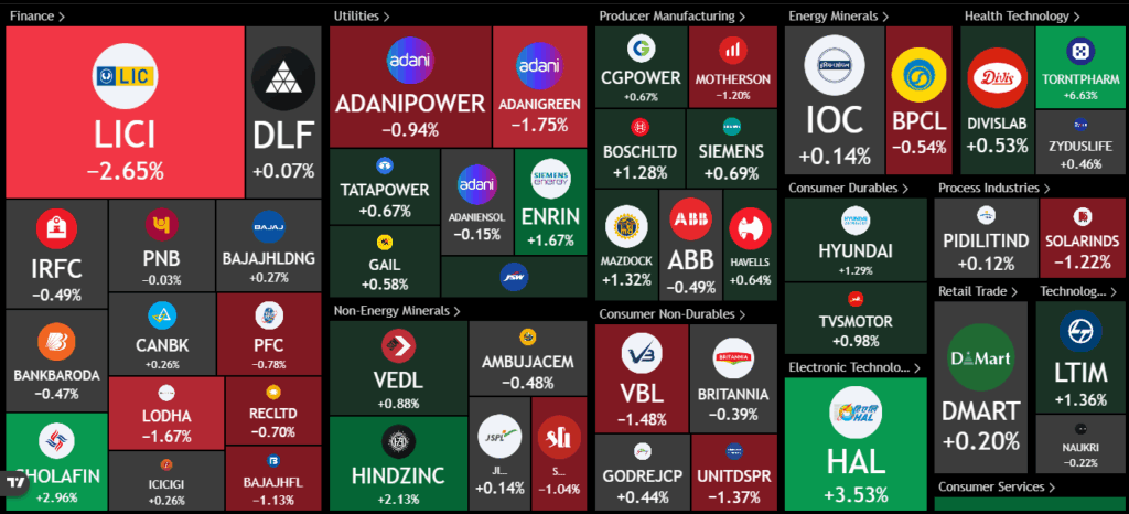 In stock movements, IT stocks saw good gains, as did Reliance, Bharti Airtel, L&T, Asian Paints, and Bajaj Finance. Losses were seen in stocks like Tata Motors, Power India, and SBI, with LIC also losing some ground. Other stocks that lost ground included Lodha, Varun Beverages, Bajaj HFL, Adani Green, Adani Power, BPCL, and United Spirits. Interestingly, several PSU and public sector enterprise stocks are coming back, such as HAL, which is one of them. Torrent Pharma was doing well in the pharma space, along with Hindustan Zinc, Chola Finance, and Enrin.
