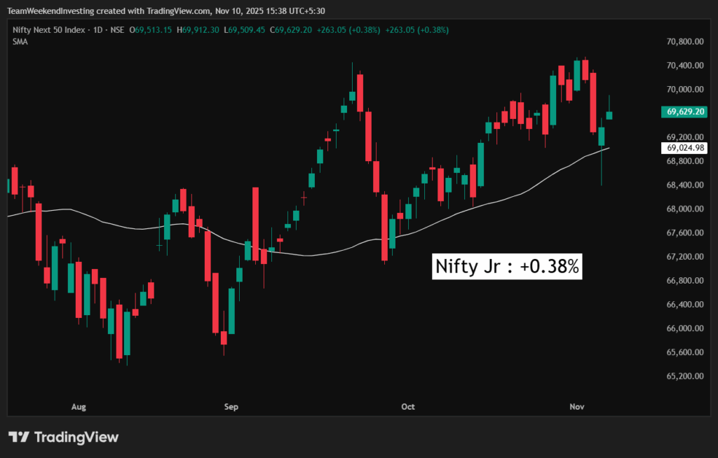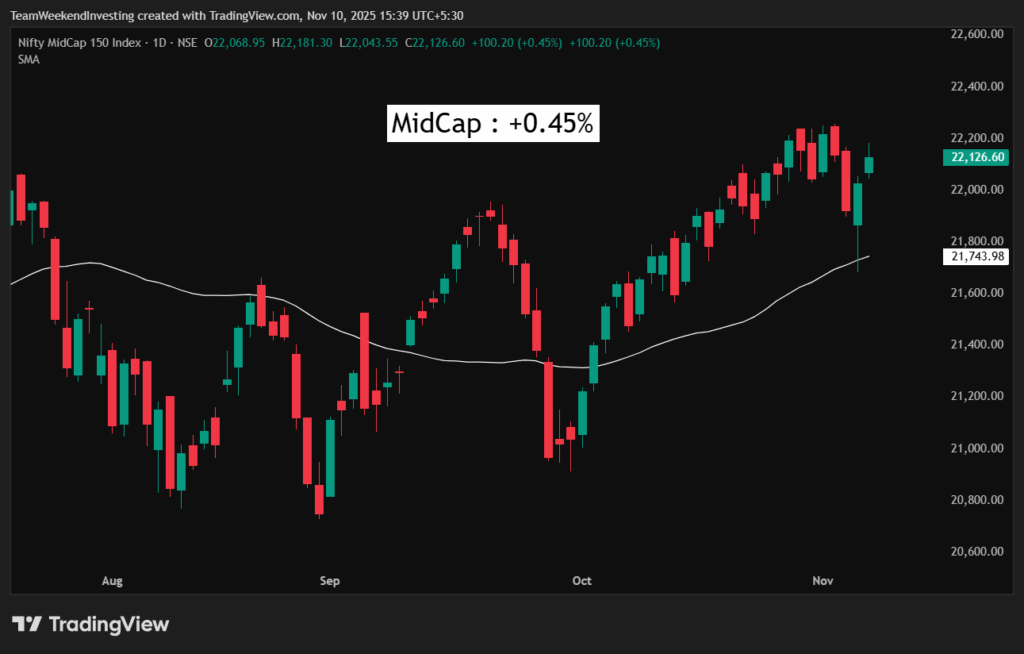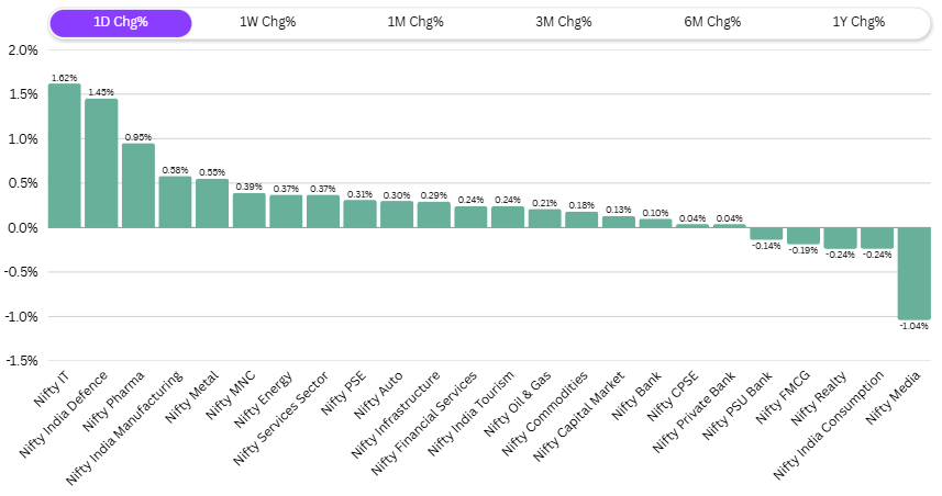 Looking at sectoral trends, Nifty IT led the pack with a 1.6% rise. Defense stocks showed a significant increase of 1.45%; this is noteworthy given that Defense has only managed 3.5% over the last three months, making today’s gain substantial. Pharma was up 0.95%, and Manufacturing also showed signs of recovery. Other sectors were inconsequential, with Media dropping at minus 1% for the day.