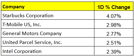 Top gainers in the US included Starbucks at +4%, T-Mobile, General Motors, United Parcel, and Intel Corporation. Please note that the weekend Investing US portfolio may hold some of these stocks.