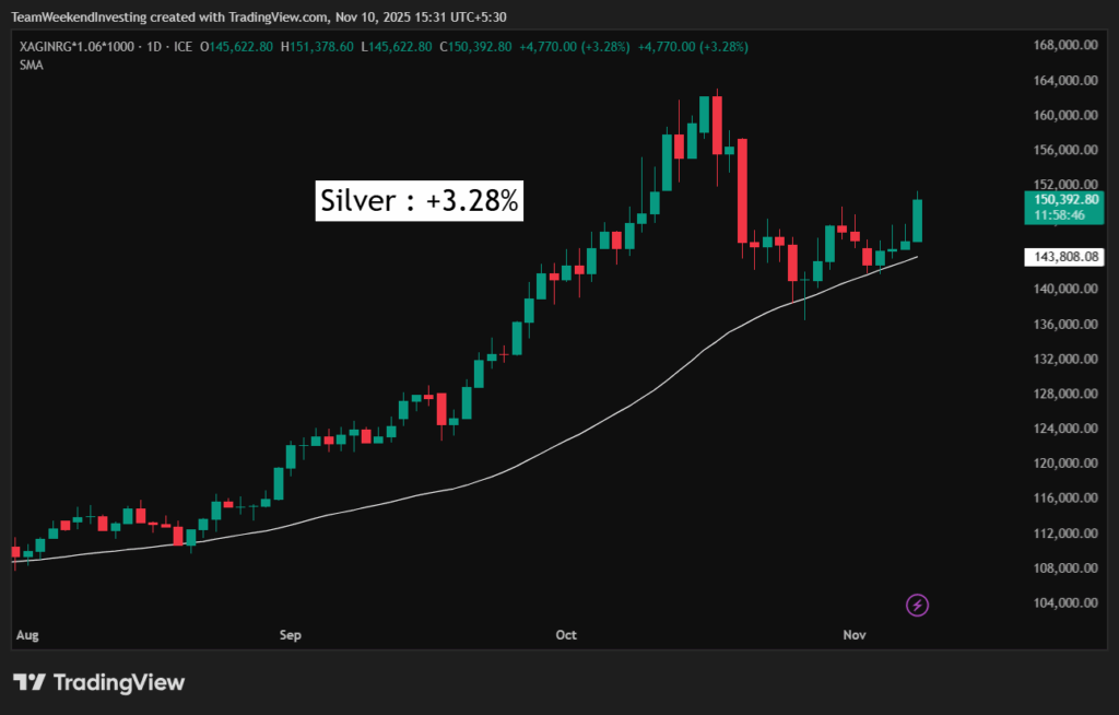 In commodities, gold is up 1.98% and has hugged its moving average very nicely. Note that calling the top of the gold bull rally could be a mistake and that the recent pause was only a brief stop on the way, which now appears complete. Gold in India (per gram, rupee terms) is now at 12,322.